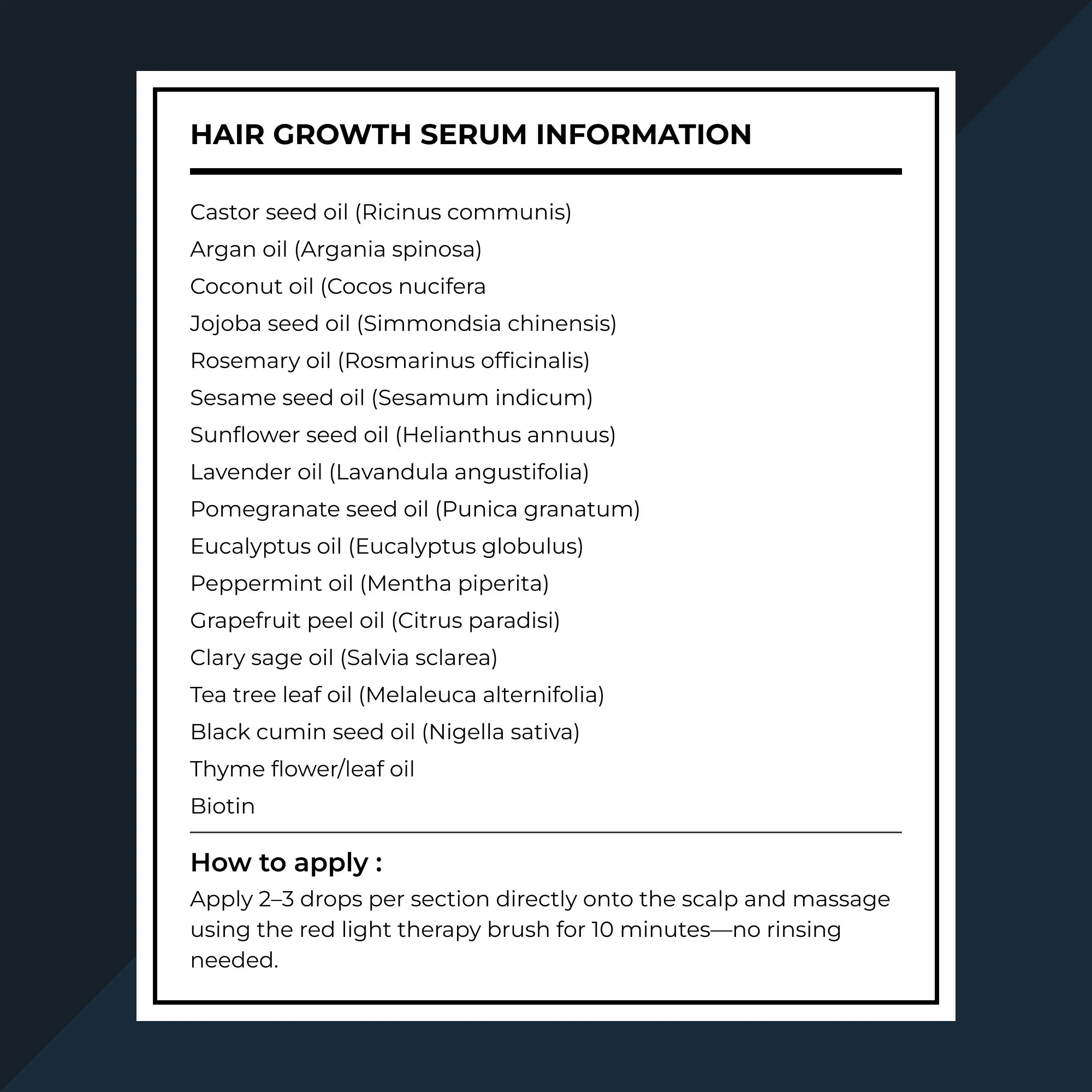 The formula works synergistically with our red light therapy brush to ensure deep penetration past the scalp barrier—where most topical treatments fail to reach the dermal papilla where growth actually happens.